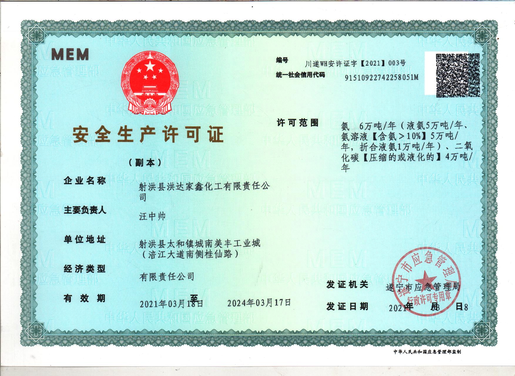 射洪縣洪達(dá)家鑫化工有限責(zé)任公司是一家年產(chǎn)6萬(wàn)噸合成氨涉農(nóng)企業(yè),成立于2002年8月。公司2005年12月通過(guò)環(huán)評(píng)驗(yàn)收。 |